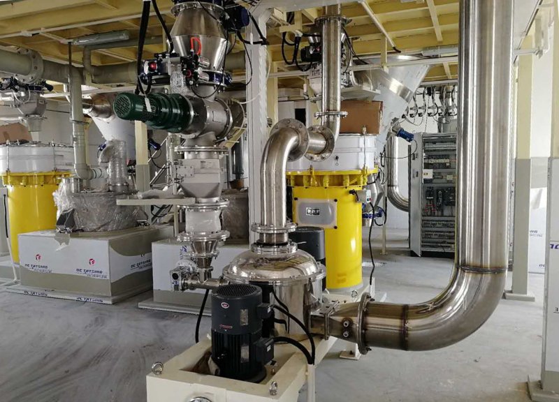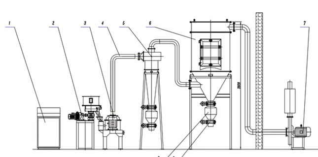 1. 控制柜 2.加料机 3.粉碎机 4.管道 5旋风分离器 6.收尘器 7.风机 8.储料罐 9.排料阀(可选非金属衬套型)